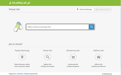 Portalu KtoMaLek.pl - pacjent zainteresowany rezerwacją leków ma możliwość wyszukiwania leków w aptekach w okolicy. Pacjent udostępnia swoją lokalizację, co pozwala na wyświetlenie aptek w pobliżu, z informacją o dostępności leku.